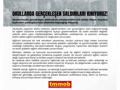 TMMOB olarak; eğitimin piyasacı ve ideolojik kuşatmadan kurtarılmasını, bilimsel temelde yeniden yapılandırılmasını, okullarda güvenliğin derhal sağlanmasını talep ediyoruz.