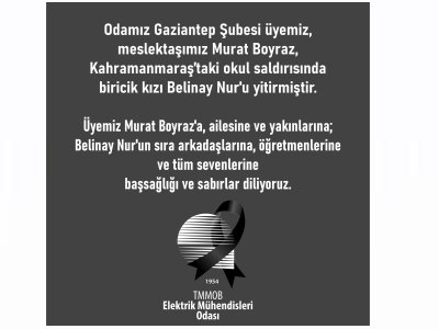 Odamız Gaziantep Şubesi üyemiz, değerli meslektaşımız Murat Boyraz, bu saldırıda biricik kızı Belinay Nur‘u yitirmiştir. Belinay Nur‘un şahsında bu vahşette hayatını kaybeden tüm çocuklarımızın ve eğitim emekçilerinin yasını yürekten taşıdığımızı, aileleriyle omuz omuza olduğumuzu dile getirmek istiyoruz. Üyemiz Murat Boyraz`a, ailesine ve yakınlarına; Belinay Nur‘un sıra arkadaşlarına, öğretmenlerine ve tüm sevenlerine başsağlığı ve sabırlar diliyoruz.