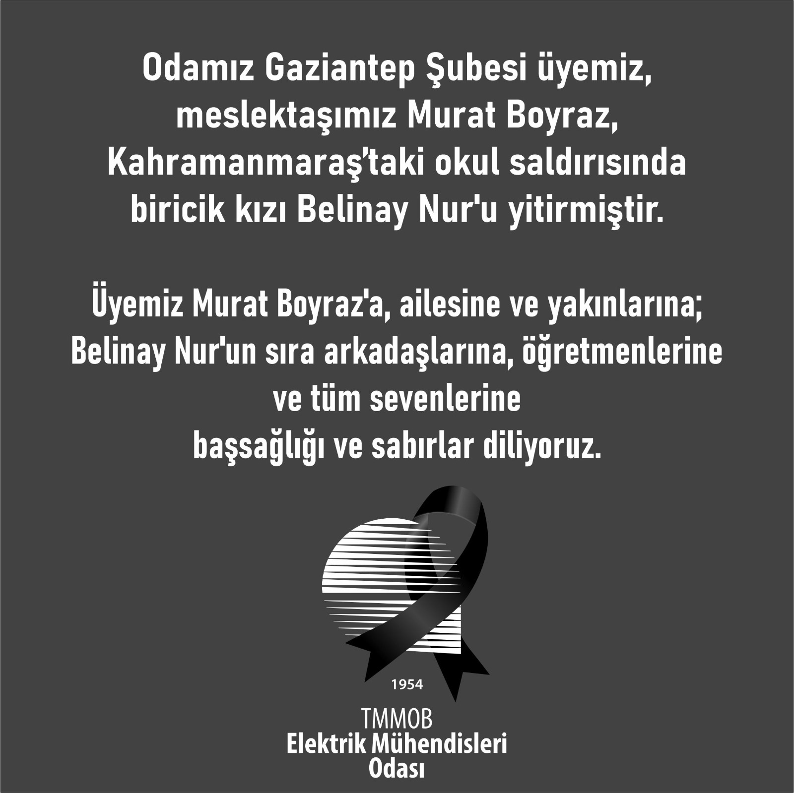 Odamız Gaziantep Şubesi üyemiz, değerli meslektaşımız Murat Boyraz, bu saldırıda biricik kızı Belinay Nur‘u yitirmiştir. Belinay Nur‘un şahsında bu vahşette hayatını kaybeden tüm çocuklarımızın ve eğitim emekçilerinin yasını yürekten taşıdığımızı, aileleriyle omuz omuza olduğumuzu dile getirmek istiyoruz. Üyemiz Murat Boyraz`a, ailesine ve yakınlarına; Belinay Nur‘un sıra arkadaşlarına, öğretmenlerine ve tüm sevenlerine başsağlığı ve sabırlar diliyoruz. Bu saldırılarda yaralananların bir an önce sağlığına kavuşmasını diliyor, tüm ülkemize geçmiş olsun diyoruz.
