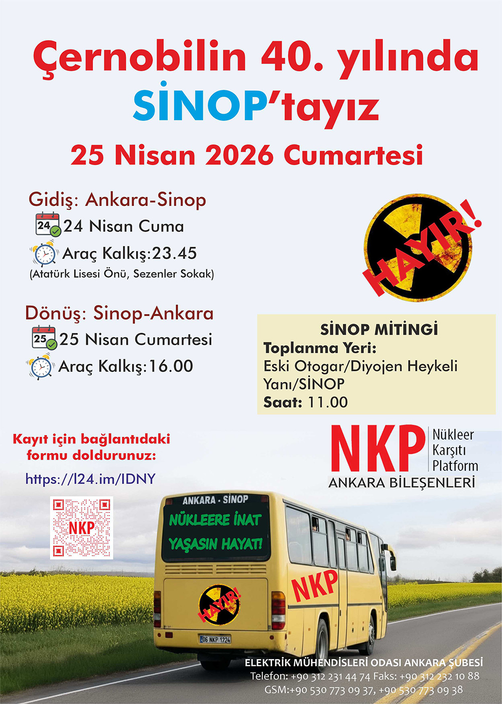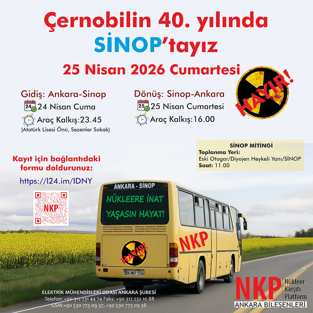 26 Nisan 1986 yılında gerçekleşen Çernobil Nükleer Santral Kazasının 40. Yılında, Sinop’ta nükleer karşıtı miting düzenleniyor. 25 Nisan 2026 (Cumartesi) tarihinde gerçekleştirilecek olan miting için Nükleer Karşıtı Platform (NKP) Ankara Bileşenleri tarafından araç kaldırılacaktır. Araçlarda yer almak için haberimizin devamındaki bağlantıdan kayıt yaptırmak gerekmektedir. Miting ve araç kalkış saatleri ile ilgili ayrıntılı bilgi haberimizin devamındadır.