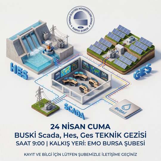 TMMOB Elektrik Mühendisleri Odası Bursa Şubesi tarafından mesleki gelişim ve saha uygulamalarının yerinde incelenmesi amacıyla Bursa Su ve Kanalizasyon İdaresi (BUSKİ) bünyesinde işletilmekte olan SCADA Merkezi, Hidroelektrik Santrali (HES) ve Güneş Enerjisi Santrali (GES) tesislerine 24 Nisan 2026 Cuma günü teknik gezi düzenlenecektir.