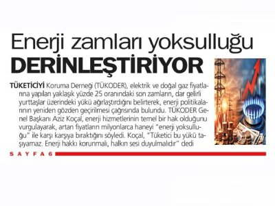 Tüketiciyi Koruma Derneği (TÜKODER), elektrik ve doğal gaz fiyatlarına yapılan yaklaşık yüzde 25 oranındaki son zamların, dar gelirli yurttaşlar üzerindeki yükü ağırlaştırdığını belirterek, enerji politikalarının yeniden gözden geçirilmesi çağrısında bulundu. TÜKODER Genel Başkanı Aziz Kocal tarafından yapılan açıklamada, enerji hizmetlerinin temel bir hak olduğu vurgulanarak, artan fiyatların milyonlarca haneyi "enerji yoksulluğu" ile karşı karşıya bıraktığı ifade edildi. Açıklamada, Elektrik Mühendisleri Odası‘nın verilerine dikkat çekilerek, dört kişilik bir ailenin asgari elektrik faturasının 595,8 TL‘den 744,7 TL‘ye yükseldiği belirtildi. Faturanın yalnızca %15‘inin enerji bedelinden oluştuğu, yaklaşık %75‘inin ise dağıtım bedeli olduğu vurgulandı. Son beş yılda dağıtım bedellerindeki artışın %880‘e ulaştığına işaret edilerek, "Gerçek zam enerjiye değil, dağıtım şirketlerine yapılmıştır" denildi.