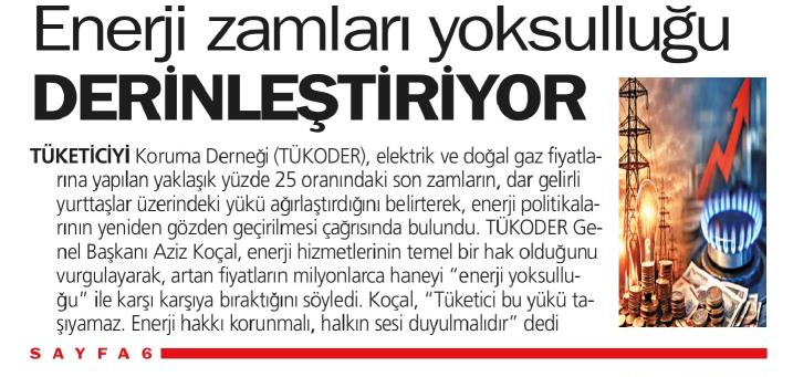 Tüketiciyi Koruma Derneği (TÜKODER), elektrik ve doğal gaz fiyatlarına yapılan yaklaşık yüzde 25 oranındaki son zamların, dar gelirli yurttaşlar üzerindeki yükü ağırlaştırdığını belirterek, enerji politikalarının yeniden gözden geçirilmesi çağrısında bulundu. TÜKODER Genel Başkanı Aziz Kocal, enerji hizmetlerinin temel bir hak olduğunu vurgulayarak, artan fiyatların milyonlarca haneyi `enerji yoksulluğu` ile karşı karşıya bıraktığını söyledi. Kocal, `Tüketici bu yükü taşıyamaz. Enerji hakkı korunmalı, halkın sesi duyulmalıdır` dedi.