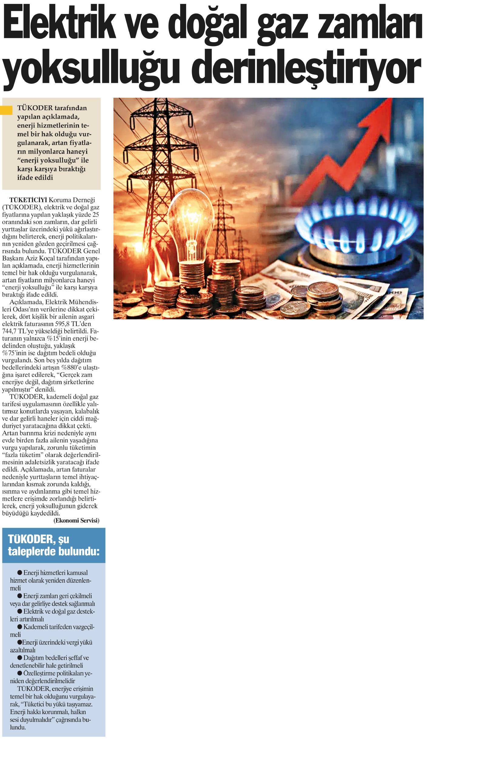 • Enerji hizmetleri kamusal hizmet olarak yeniden düzenlenmeli • Enerji zamları geri çekilmeli veya dar gelirliye destek sağlanmalı • Elektrik ve doğal gaz destekleri artırılmalı • Kademeli tarifeden vazgeçilmeli • Enerji üzerindeki vergi yükü azaltılmalı • Dağıtım bedelleri şeffaf ve denetlenebilir hale getirilmeli • Özelleştirme politikaları yeniden değerlendirilmelidir TÜKODER, enerjiye erişimin temel bir hak olduğunu vurgulayarak, "Tüketici bu yükü taşıyamaz. Enerji hakkı korunmalı, halkın sesi duyulmalıdır" çağrısında bulundu.