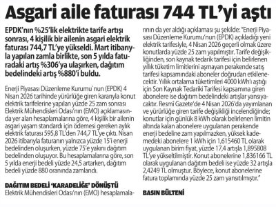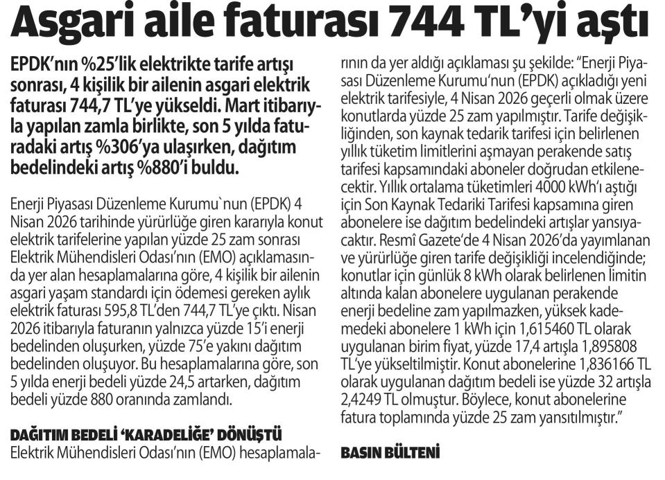 Enerji Piyasası Düzenleme Kurumunun (EPDK) 4 Nisan 2026 tarihinde yürürlüğe giren kararıyla konut elektrik tarifelerine yapılan yüzde 25 zam sonrası Elektrik Mühendisleri Odası‘nın (EMO) açıklamasında yer alan hesaplamalarına göre, 4 kişilik bir ailenin asgari yaşam standardı için ödemesi gereken aylık elektrik faturası 595,8 TL‘den 744,7 TL‘ye çıktı. Nisan 2026 itibarıyla faturanın yalnızca yüzde 15‘i enerji bedelinden oluşurken, yüzde 75‘e yakını dağıtım bedelinden oluşuyor. Bu hesaplamalarına göre, son 5 yılda enerji bedeli yüzde 24,5 artarken, dağıtım bedeli yüzde 880 oranında zamlandı.