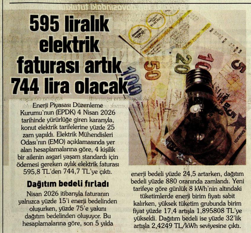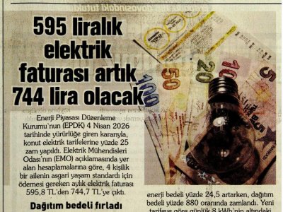 Enerji Piyasası Düzenleme Kurumu nun (EPDK) 4 Nisan 2026 tarihinde yürürlüğe giren kararıyla, konut elektrik tarifelerine yüzde 25 zam yapıldı. Elektrik Mühendisleri Odası`nın (EMO) açıklamasında yer alan hesaplamalarına göre, 4 kişilik bir ailenin asgari yaşam standardı için ödemesi gereken aylık elektrik faturası 595,8 TL`den 744,7 TL`ye çıktı.