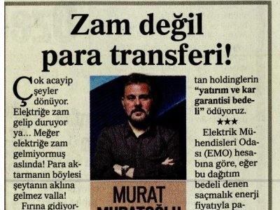 Çok acayip şeyler dönüyor. Elektriğe zam gelip duruyor ya... Meğer elektriğe zam gelmiyormuş aslında! Para aktarmanın böylesi şeytanın aklına gelmez valla! Fırına gidiyorsunuz, ekmek alacaksınız. Fırıncı diyor ki; `Ben zam yapmadım, ekmek hâlâ 1 lira...` Seviniyorsunuz haliyle... Tam parayı uzatıp ekmeği alacakken araya biri girip diyor ki; `Dur bakalım bu ekmeği fırından alıp sana uzatmanın bedeli 10 lira!`