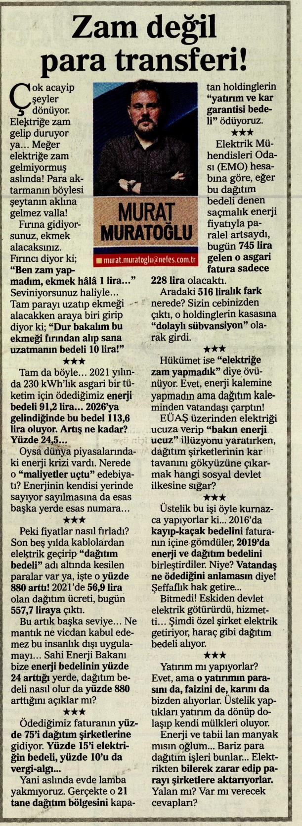 Üstelik bu işi öyle kurnazca yapıyorlar ki... 2016‘da kayıp-kaçak bedelini faturanın içine gömdüler, 2019‘da enerji ve dağıtım bedelini birleştirdiler. Niye? Vatandaş ne ödediğini anlamasın diye! Şeffaflık hak getire... Bitmedi! Eskiden devlet elektrik götürürdü, hizmetti... Şimdi özel şirket elektrik getiriyor, haraç gibi dağıtım bedeli alıyor.