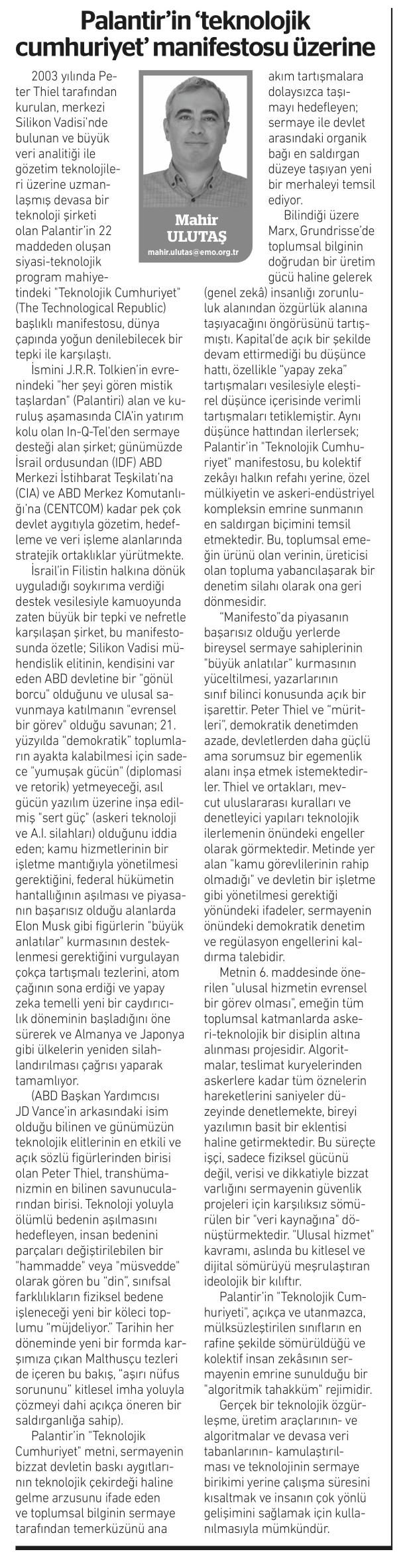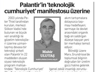 2003 yılında PeterThiel tarafından kurulan, merkezi Silikon Vadisi`nde bulunan ve büyük veri analitiği ile gözetim teknolojileri üzerine uzmanlaşmış devasa bir teknoloji şirketi olan Palantir`in 22 maddeden oluşan siyasi-teknolojik program mahiyetindeki `Teknolojik Cumhuriyet` (The Technological Republic) başlıklı manifestosu, dünya çapında yoğun denilebilecek bir tepki ile karşılaştı.