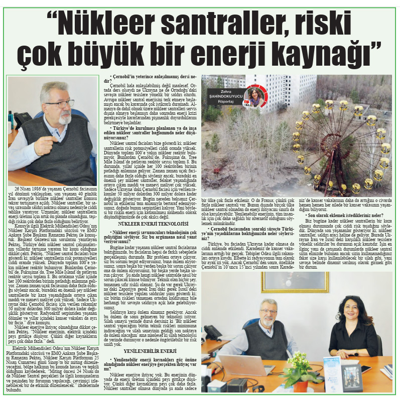 26 Nisan 1986’da yaşanan Çernobil faciasının yıl dönümü yaklaşırken, son yaşanan 40 günlük İran savaşıyla birlikte nükleer santraller konusu tekrar tartışmaya açıldı. Nükleer santraller, bir savaş sırasında saldırı noktası olması nedeniyle ciddi tehlike yaratıyor. Uzmanlar, nükleer santrallerin enerji üretimi için artık ön planda olmadığını, taşıdığı riskin çok daha fazla olduğunu belirtiyor.