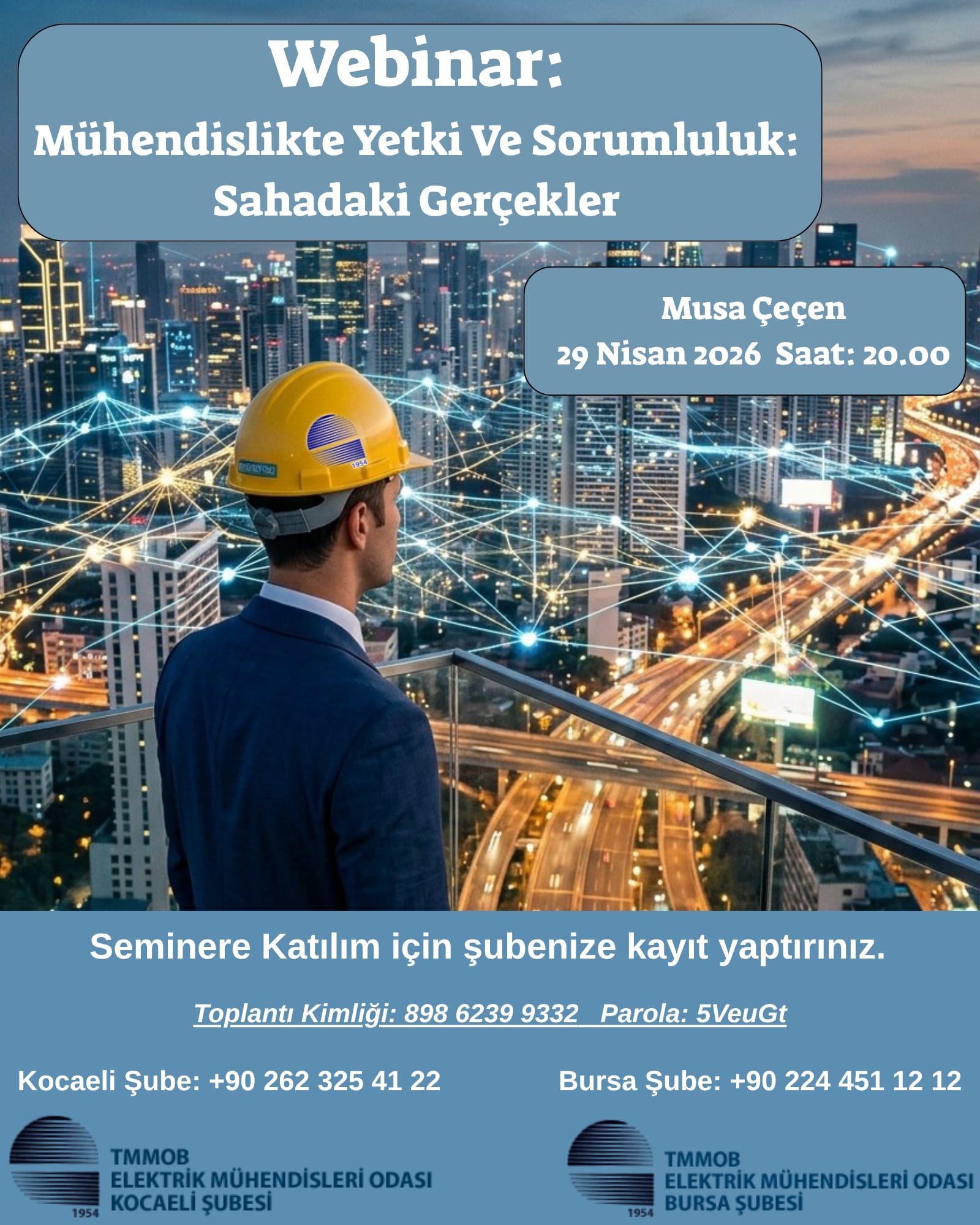 Bu kapsamda Elektrik Mühendisleri Odası Bursa Şubesi ile ortak düzenleyeceğimiz "Mühendislikte Yetki ve Sorumluluk: Sahadaki Gerçek" konulu webinarımızda; Mevzuatın sahaya yansımaları, Yetki-sorumluluk dengesinde karşılaşılan gerçek durumlar, Uygulamada yaşanan sorunlar ve çözüm yaklaşımları ele alınacaktır. 📅 Tarih : 29.04.2026 🕒 Saat : 20.00 💻 Platform : Zoom (Toplantı Kimliği: 898 6239 9332 Parola: 5VeuGt)
