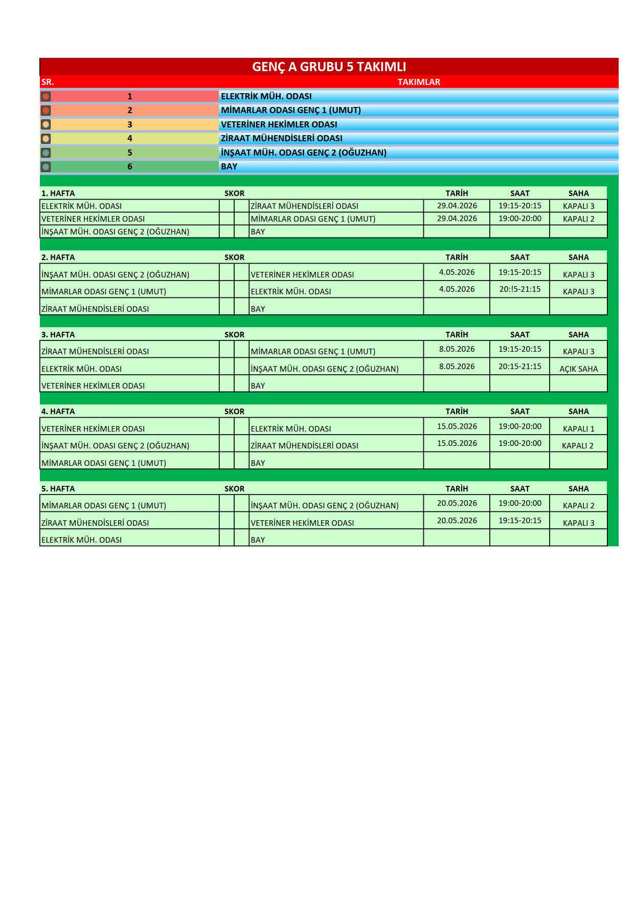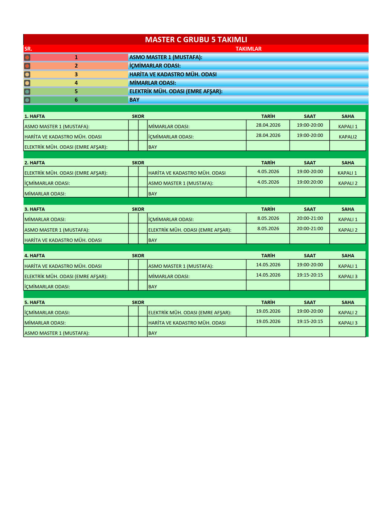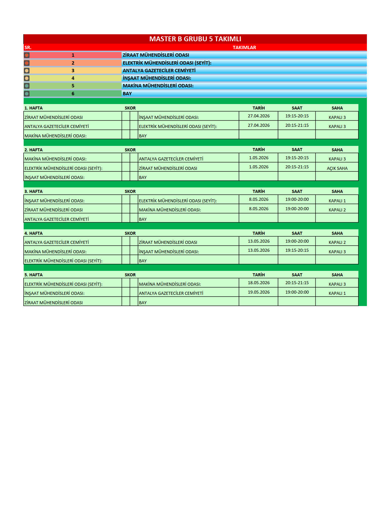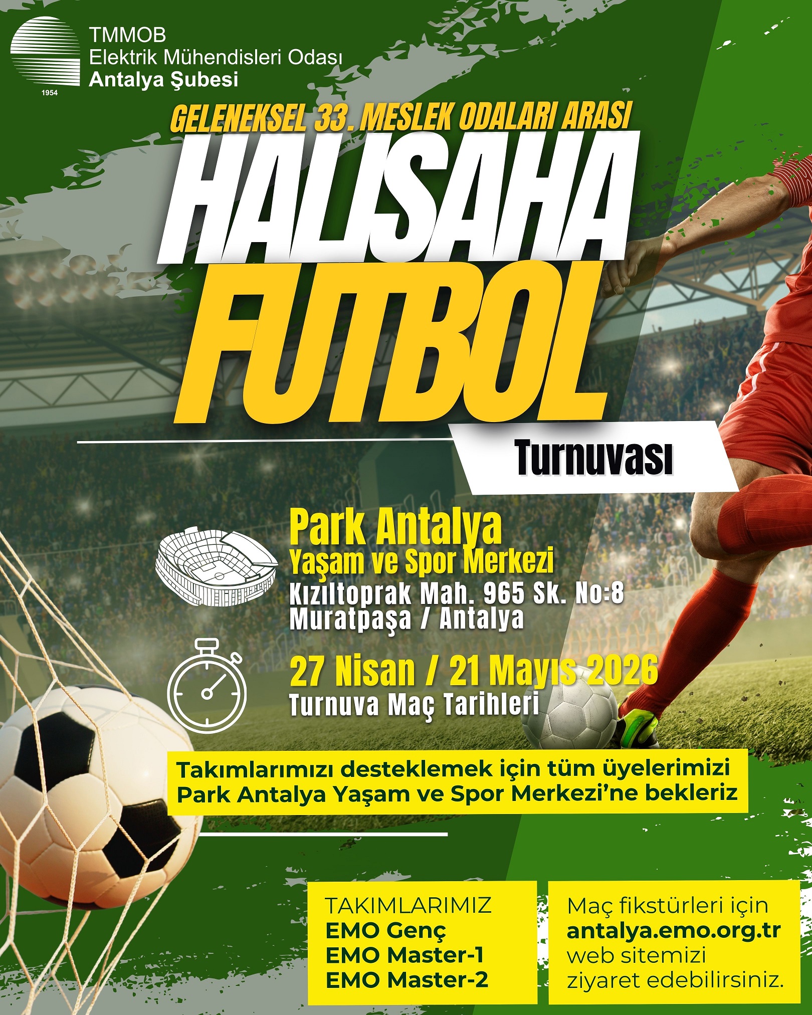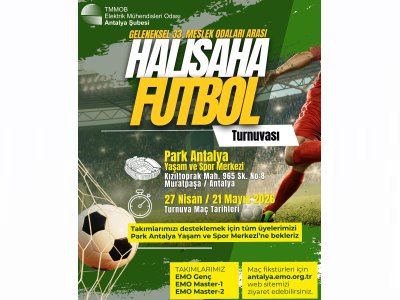 Meslek Odaları arasındaki dayanışmayı güçlendirmek amacıyla, bu yıl 33.si düzenlenen Geleneksel Antalya Meslek Odaları arası Halı Saha Futbol Turnuvası 27 Nisan 2026 Pazartesi günü başlıyor. EMO Master-1, EMO Master-2 ve EMO Genç takımlarımızın katıldığı turnuva bu yıl Park Antalya Yaşam ve Spor Merkezinde (Kızıltoprak Mah. 965 Sok. No:8 Muratpaşa/Antalya) düzenlenecektir. Tüm üyelerimizi, takımlarımızı desteklemeye davet ediyoruz. Turnuva fikstürüne yazımız ekinden ulaşabilirsiniz.