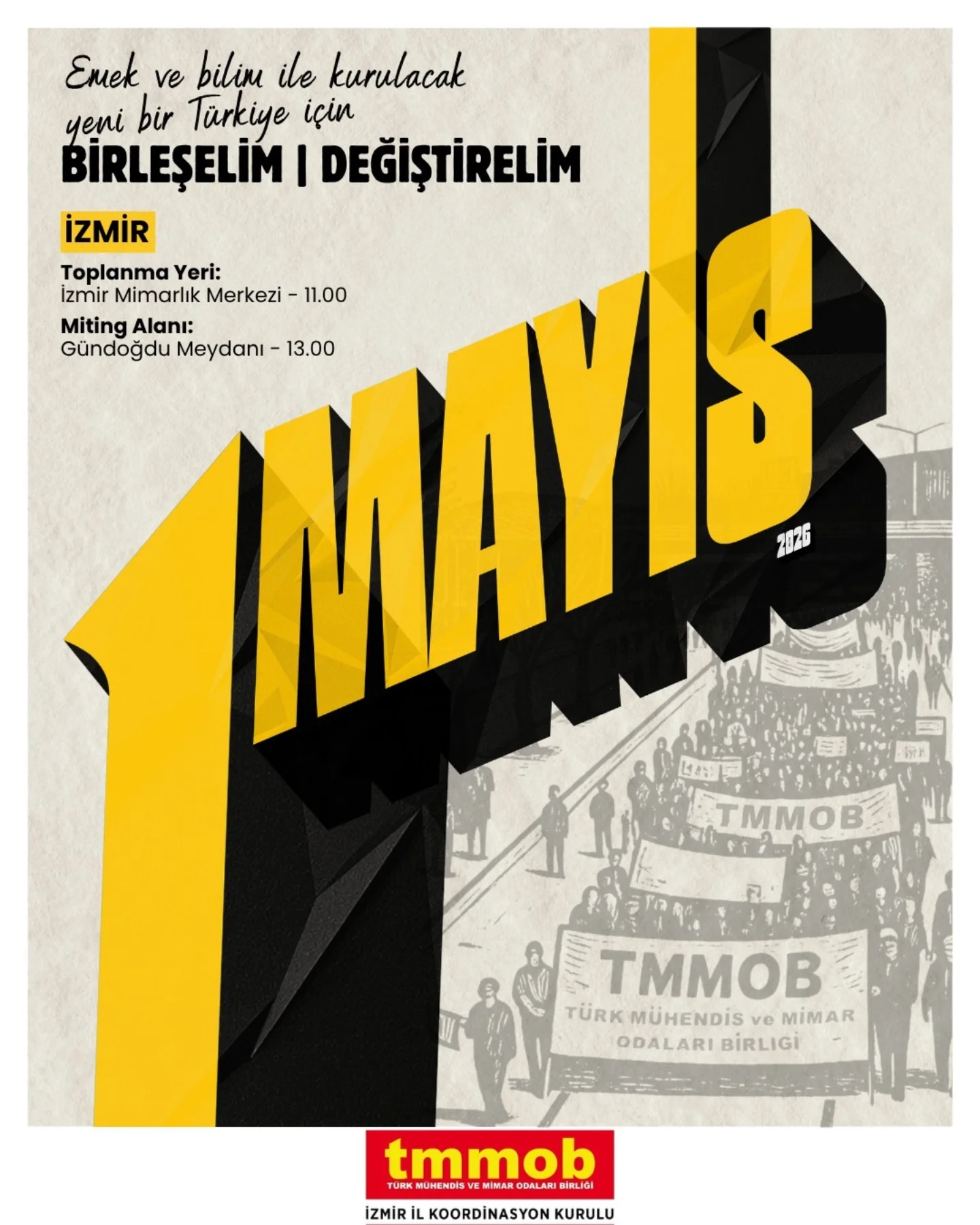 Emek ve bilimle kurulacak yeni bir Türkiye için 1 Mayıs’ta alanlara çıkıyoruz. İzmir Mimarlık Merkezi önünde 11.00’de toplanacak olan mühendis, mimar ve şehir plancıları, saat 13.00’te Gündoğdu Meydanı’ndaki mitinge TMMOB İzmir İl Koordinasyon Kurulu pankartıyla katılacak. Tüm üyelerimiz savaşa ve sömürüye karşı; adalet, özgürlük ve eşitlik için 1 Mayıs alanlarına davet ediyoruz.