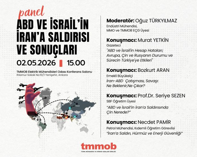 Türk Mühendis ve Mimar Odaları Birliği (TMMOB) Enerji Çalışma Grubu tarafından, ABD ve İsrail’in İran’a saldırısının ve sonuçlarının ülkemiz, bölge ülkeleri, kıta ve dünya ölçeğinde ele alınacağı `ABD ve İsrail`in İran`a Saldırısı ve Sonuçları Paneli` 2 Mayıs 2026 Cumartesi günü EMO Konferans Salonu`nda gerçekleştirilecektir.