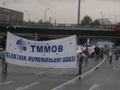 Türkiye'nin dört bir yanından otobüsler ve tren seferleri ile Ankara'ya ulaşan binlerce mühendis, mimar ve şehir plancı sabahın erken saatlerinde Ankara Garı önünde buluştu. Sağnak yağmura rağmen, düzenli kortejler oluşturan binlerce kişi, pankartları ve dövizleri ile sloganlar eşliğinde yürüdü. TMMOB mitingi katılımcıları meslek alanlarındaki sorunlar ile ülke sorunlarına ilişkin sloganlar attı. Mühendislerin taşıdığı pankartlar arasında, metrelerce uzunluktaki "Yabancıların çalışma izni konusunda değişiklik yapan yasa tasarısı Meclis gündeminden çıkarılsın, ülkemizde mülteci olmayacağız" yazılı olanı dikkat çekti. Mitingde mühendisler, mimarlar, şehir plancıları meslek alanlarında yaşanan sorunları dile getirdi. Elektrik mühendisleri, enerjide özelleştirme ve nükleer santral planının durdurulmasını isterken, çevre mühendisleri Hasankeyf, Allionai gibi çevresel değerlerin yağmalanmasını protesto etti. Maden ve jeoloji mühendisleri doğal kaynakların gerçek sahibinin halk olduğunu vurgularken, makine mühendisleri, "Üreterek büyüyen bir Türkiye" talep etti. Ziraat mühendisleri tarımdaki yıkımın durdurulmasına, şehir plancıları kentlerin sermaye işgaline terk edilmesine, gıda mühendisleri de gıda alanındaki denetimsizliğe tepki gösterdi. Hasan Balıkçı unutulmadı Elektrik Mühendisleri Odası (EMO) üyelerinin oluşturduğu kortejde ise "Yaşasın Özgür Yazılım", "Enerji'ne sahip çık", "Yeniden Kamulaştırma", "Özelleştirmeye Hayır" ve "Mühendisler Susmayacak" dövizleri taşındı. Kaçak elektrik mücadelesi ile tanınan ve Uluslararası Saydamlık Örgütü tarafından 2004 Uluslararası Dürüstlük Ödülü‘ne değer görülen Hasan Balıkçı da mitingde unutulmadı. Kaçak elektrik kullanan bir fabrika sahibinin tutuğu kiralık katil tarafından ‘şehit' edilen Balıkçı anısına EMO tarafından yayınlanan ‘Yalnız Değilsin' adlı kitabın kapak görüntüsünden yapılan dev poster yürüyüş boyunca taşınarak, Balıkçı'nın mücadelesinin yaşatılacağı mesajı verildi. EMO Ankara Şubesi üyelerinin oluşturduğu kortejde ise, Şube ana pankartının yanı sıra üzerlerinde "Özelleştirmeye, Taşeronlaştırmaya, Kadrolaşmaya, Esnek Çalıştırılmaya Karşı, Örgütlü Mücadele" ve "Nükleer Santral İstemiyoruz !" pankartları da açıldı. Mitinge, Ankara'da bir süredir nükleer karşıtı yürüyüşlerini devam ettiren gazeteci Timur Danış ile Hediye Gündüz de "Nükleer Yasaya karşı yürüyorum" pankartıyla katıldı. Jeoloji Mühendisleri Odası öğrenci üyeleri, geçtiğimiz yaz Sinop'taki Nükleer Karşıtı Kamp'ta boğularak yaşamını yitiren üç genci, "Nükleere inat, Soner, Öner, Güneş yaşayacak" pankartı ile andı. Soğancı, "Bizleri sokağa döken siyasal iktidar utanmalıdır" Miting meydanında konuşan TMMOB Yönetim Kurulu Başkanı Mehmet Soğancı, "Bugün ‘itirazımız var‘ demek için buradayız. Bu miting siyasi iktidarı uyarı mitingidir" dedi. Soğancı, sözlerini şöyle sürdürdü: "Bu ülkenin mühendisini, mimarını, şehir plancısını sokağa döken siyasal iktidar utanmalıdır. Bizleri gözden çıkaran siyasi iktidarı biz de gözden çıkardık. AKP son yılların en çalışkan hükümeti olarak neo-liberal yasaları bir bir çıkarıyor. Bu yasalarla başta eğitim, sağlık olmak üzere kamusal alan özelleştiriliyor. Kamu işletmeleri sermayeye devrediliyor. Sermaye bütün alanlara sızarken kamu ortadan kalkıyor. Bizim için mücadele zamanı geldi. Halkın çıkarları için mücadele esastır." "Türkiye Ortadoğu bataklığına sürükleniyor" TMMOB olarak barış istediklerini dile getiren Soğancı, son zamanlarda Türkiye‘de tırmanan linç kültürünün yok edilmesi gerektiğini vurguladı. "Her türlü farklı düşünce bastırılmaya çalışılıyor" diyen Soğancı şunları kaydetti: "12 Eylül hukukunun uzantısı olan 301. madde kaldırılmalıdır. Özgürlükçü bir anayasa hazırlanmalıdır. Kürt sorununda şiddetin tekrar gündeme gelmemesi için kalıcı politikalara ihtiyaç vardır. Şiddetten beslenen çevreler insanımız arasına düşmanlık tohumları ekiyor. Lübnan‘a asker gönderen AKP iktidarı hesap vermek zorundadır. Bunun hesabını bizler, bu meydan soracaktır. Türkiye Lübnan‘a asker gönderme kararından vazgeçmelidir. Türkiye bataklığa sürüklenmemelidir." Siyasal iktidarın, yeni yatırımlarla kendi insanına iş olanağı yaratmak yerine, mevcut çalışma alanlarını da yabancılara açmak için çaba harcadığını ifade eden Soğancı, "Mühendislik ve mimarlık fakültelerinden mezun olanlar işsiz kalıyor. Şimdi haklarımıza ve özgürlüklerimize sahip çıkma zamanıdır" diye konuştu. "Yurttaşlık haklarımızı elimizden almaya çalışanlara ‘dur' diyoruz" TMMOB yasasına gereksiz ve yanlış yapılan müdahalelerde bulunulduğunu kaydeden Soğancı, ‘Siyasal iktidarın, IMF‘nin talimatıyla yasamızda yapacağı değişiklikle ülkemizin kapılarını akademik ve mesleki yeterliliği kanıtlanmamış yabancı mühendis, mimar ve şehir plancılarına sonuna kadar açmak için Meclis‘e getirdiği, kalitesiz hizmetin kontrolsüz sunumuna olanak tanıyan ‘yabancıların çalışma iznini düzenleyen yasa'da yapılacak değişikliğe hayır diyoruz. Küresel kapitalist sermaye istiyor diye, bizi kendi ülkemizde mülteci, yabancı konumuna getiren, yurttaşlık haklarımızı elimizden almak isteyen siyasal iktidara dur demek için buradayız" diye konuştu. Dikmen Vadisi halkı da miting de idi. Ülkenin dört bir yanından gelen binlerce mühendisin eylemi çeşitli siyasi partiler, demokratik kitle örgütleri, öğrenciler ve Ankaralı vatandaşlar tarafından da desteklendi. Ankara Dikmen Vadisi halkı da çoluk çocuk mitingde yerini aldı. Yaklaşık 300 Dikmenli "Evimize ka