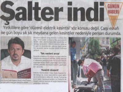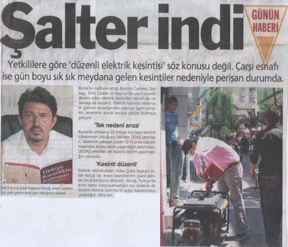 Bursa 'daki elektrik kesintileri hakkında Şube Yönetim Kurulu Başkanımız Erdal AKTUĞ, 04 Ağustos 2007 tarihli Bursa Hakimiyet Gazetesinin sorularını yanıtladı.