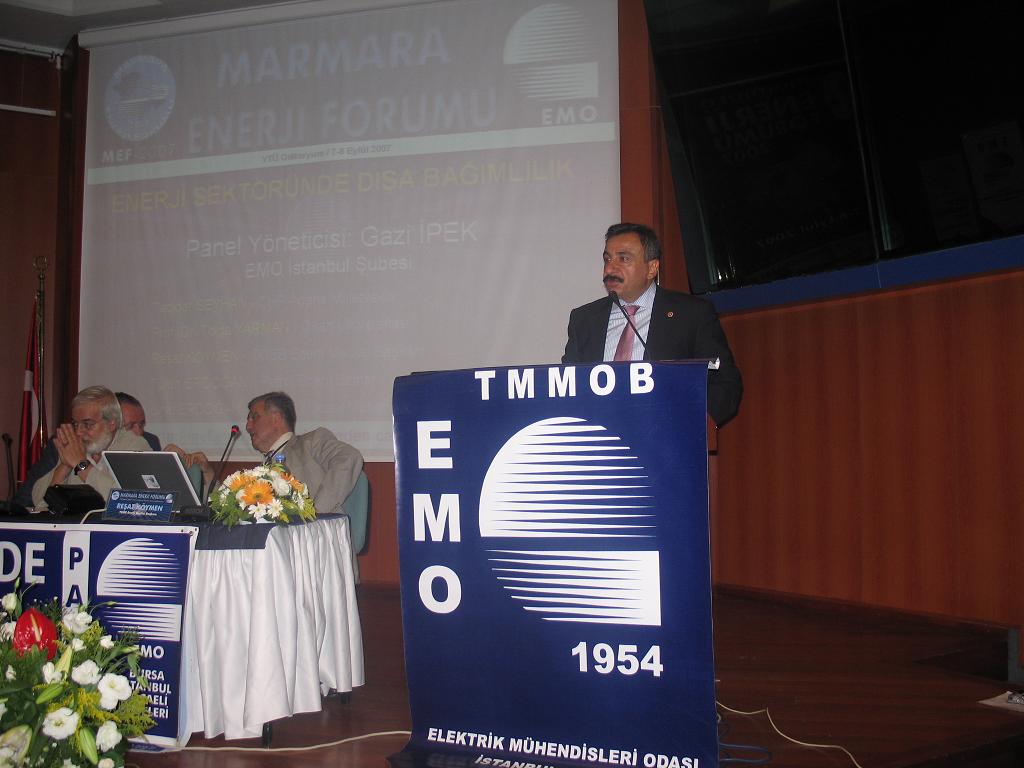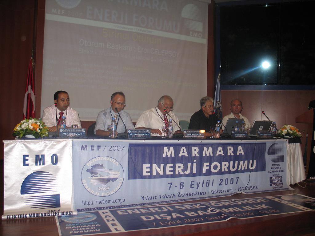 TMMOB Elektrik Mühendisleri Odası Bursa-İstanbul-Kocaeli Şubelerinin ortaklığında düzenlenen Marmara Enerji Forumu 2007 07-08 Eylül 2007 tarihinde YTÜ Oditoryumunda gerçekleşti. Şubemizden yoğun bir katılımın gerçekleştiği MEF 2007‘de iki gün boyunca toplam 250‘ye yakın kişi katıldı. Forum, EMO İstanbul Şube Yönetim Kurulu Başkanı Erol Celepsoy‘un açılış konuşmasıyla başladı. Celepsoy‘un konuşmasından sonra kürsüye EMO Yönetim Kurulu Başkanı Kemal Ulusaler davet edildi. Daha sonra kürsüye çıkan TMMOB Yönetim Kurulu Başkanı Mehmet Soğancı konuşmasında TMMOB‘a bağlı odaların yaptığı etkinliklerden, bu etkinlikler içinde enerji konusunun ciddi bir yer tuttuğundan söz etti. Açılış konuşmalarının ardından Marmara Enerji Forumu için hazırlanan, elektrik enerjisinin insan yaşamı için önemi ve elektrik enerjisinin ülkemizdeki kısa tarihi içerikli film gösterimine geçildi. Katılımcılar tarafından ilgiyle izlenen filmin ardından Forumun tek çağrılı bildirisi Okan Üniversitesi‘nden Prof. Dr. Tolga YARMAN tarafından Nükleer enerji konulu sunum yapıldı. Açılış gündeminin arkasından öğle yemeğinden sonra 1. Oturum‘a geçildi. Başkanlığını EMO İstanbul Şube Yönetim Kurulu Başkanı Erol Celepsoy‘un yaptığı oturumun konusu ENERJİ KAYNAKLARININ BÖLGESEL İNCELENMESİ idi. EÜAŞ, MTA, BOTAŞ, ve EMO temsilcilerinin katıldığı oturum sonrasında, ENERJİ SEKTÖRÜNDE DIŞA BAĞIMLILIK konulu panele geçildi. Yöneticiliğini Şubemizden Gazi İpek‘in yaptığı panelin katılımcıları, Tacidar Seyhan - CHP Adana Milletvekili, Prof. Dr. Tolga Yarman - Okan Üniversitesi, Reşat Köymen - TOBB Enerji Meclisi Başkanı, Tufan Erdoğan - Petrol Mühendisi, Ünal Erdoğan - Elektrik Y. Mühendisi idi. Marmara Enerji Forumu‘nun ikinci günü ENERJİDE İLETİM ve DAĞITIMIN BÖLGESEL İNCELENMESİ konulu 2. Oturum ile başladı. Başkanlığını Şubemiz Yönetim Kurulu Başkanı Erdal Aktuğ tarafından yapılan 2. Oturuma katılan kurumlar; TEİAŞ, TREDAŞ, BEDAŞ, AYEDAŞ, SEDAŞ, UEDAŞ ve EMO idi. 2. Oturumun da tamamlanmasının ardından 3. Oturum‘a geçildi. Başkanlığını EMO Kocaeli Şubesi Yönetim Kurulu Başkanı Ahmet Sözen tarafından yapılan oturumun konusu ENERJİDE VERİMLİLİK, KALİTE ve TÜKETİCİ HAKLARI idi. Katılımcılar ise, EİEİ, TEDAŞ, OSB, TÜKODER ve EMO temsilcileri oldu. 3. Oturumun da tamamlanmasının ardından 2. Panel konusu olan KÜRESEL ISINMA ve ENERJİ POLİTİKALARI konusu ele alındı. Yöneticiliğini EMO Diyarbakır Şubesi Yönetim Kurulu Başkanı olan Nedim Tüzün‘ün yaptığı Panele katılanlar, Prof. Dr. Orhan Şen - İstanbul Teknik Üniversitesi, Doç. Dr. Tanay Sıdkı Uyar - Marmara Üniversitesi Enerji Ana Bilim Dalı Başkanı, Ömer Madra - Açık Radyo Yayın Yönetmeni ve Bilgi Üniversitesi Öğretim Üyesi, Yunus Arıkan - REC Türkiye İklim Değişikliği Proje Yöneticisi, Cengiz Göltaş - EMO Yönetim Kurulu Yazman Üyesi. Forum programı 2. günün akşamı Boğaz‘da yapılan Tekne Turu ile son buldu. Yakın bir zamanda Sonuç Bildirgesi yayınlanacak olan Marmara Enerji Forumu‘na sunulan bildiriler ve paneller bir yayın halinde kamuoyuna isteyen üyelerimize sunulacaktır.
