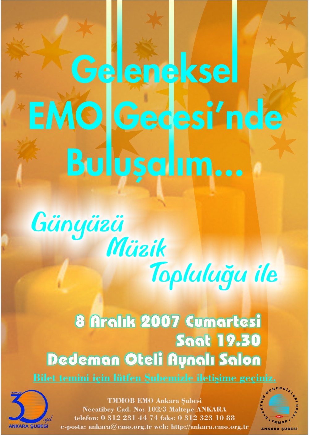 Bu yıl Geleneksel EMO Gecesi 8 Aralık 2007 Cumartesi saat 19.30'da Dedeman Oteli Aynalı Salon'da gerçekleştirilecek. Meslekte 40. ve 50. yıllarını dolduran üyelerimize plaketlerinin verileceği geceye Günyüzü Müzik Topluluğu da ezgileriyle eşlik edecekler. Ayrıntılı bilgi ve bilet temini için lütfen Şubemizle iletişime geçiniz.