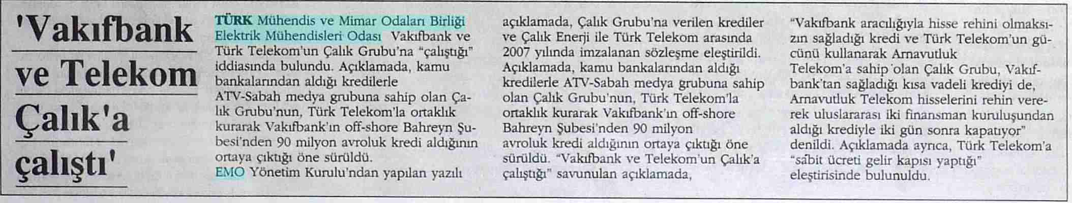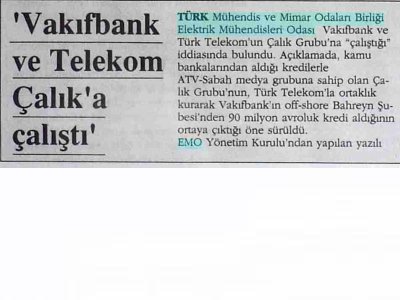 TÜRK Mühendis ve Mimar Odaları Birliği Elektrik Mühendisleri Odası Vakıfbank ve Türk Telekom'un Çalık Grubu'na "çalıştığı" iddiasında bulundu. Açıklamada, kamu bankalarından aldığı kredilerle ATV-Sabah medya grubuna sahip olan Çalık Grubu'nun, Türk Telekom'la ortaklık kurarak Vakıfbank'ın off-shore Bahreyn Şubesi'nden 90 milyon avroluk kredi aldığının ortaya çıktığı öne sürüldü.