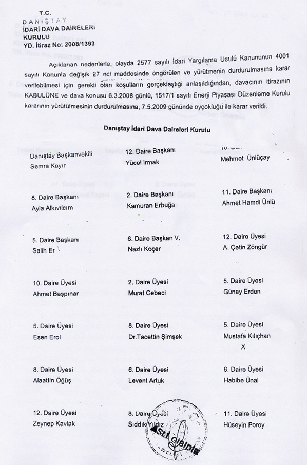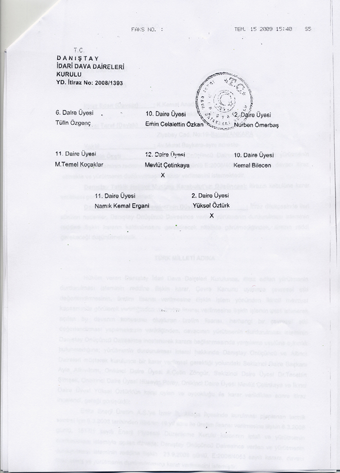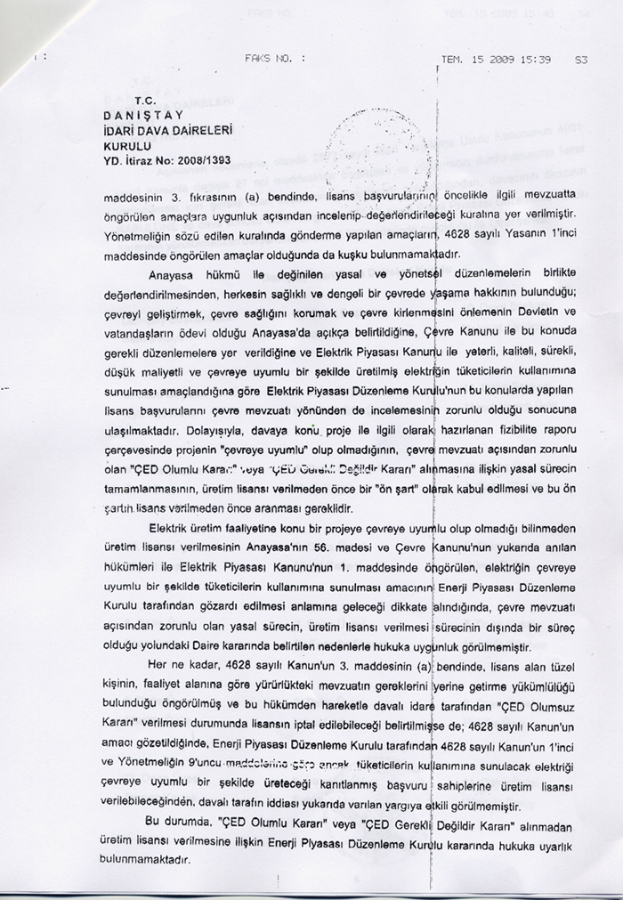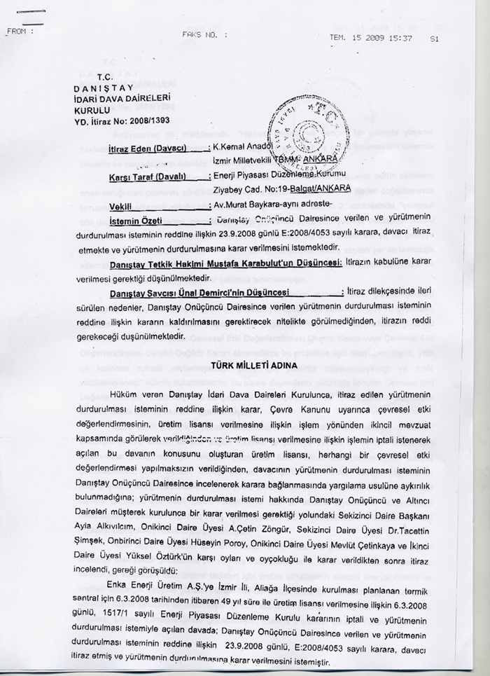 Danıştay İdari Dava Daireleri Kurulu "Enerji Piyasası Düzenleme Kurulunun İzmir İli Aliağa İlçesinde İthal Kömür Yakıtlı tesis kurulması için Enka Enerji Üretim A.Ş.'ye 06/03/2008 tarihinden itibaren 49 yıllığına üretim lisansı verilmesi" işleminin yürütmesini durdurdu.