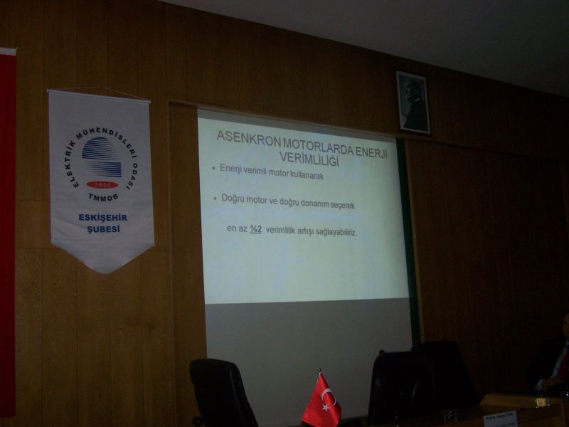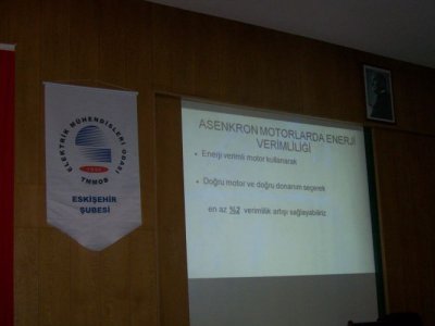 Elektrik Mühendisleri Odası ve Makina Mühendisleri Odası Eskişehir Şubelerinin ortaklaşa düzenlediği "Sanayi‘de Enerji Verimliliği" Semineri 31 Mayıs 2012 Cuma günü Eskişehir Sanayi Odası Konferans Salonunda gerçekleştirildi. Saat 14.00‘da, MMO Eskişehir Şubesi Yönetim Kurulu Başkanı Hakan ÜNAL`ın açılış konuşması ile başlayan etkinlik, ESO Başkanı Savaş ÖZAYDEMİR ve ilimiz Vali Yardımcısı Ömer Faruk GÜNAY`ın konuşmaları ile devam etti. Yapılan açılış konuşmalarında ortak vurgu, dünyada enerji kaynaklarının tükenmesi ve enerjinin verimli kullanılması gerekliliği üzerineydi. Açılış konuşmalarının ardından yapılan ilk oturumda, Eskişehir Osmangazi Üniversitesi Mühendislik Mimarlık Fakültesi Makina Mühendisliği Bölümü Öğretim Görevlisi Prof. Dr. L. Berrin ERBAY "Dünyada Enerji Verimliliği" başlıklı ve Anadolu Üniversitesi Fen Fakültesi Biyoloji Bölümü Ekoloji Ana Bilim Dalından Prof. Dr. Cengiz TÜRE "Karbon Ayak İzi" başlıklı sunumlarını gerçekleştirdiler. Verilen aranın ardından Şubemiz Yönetim Kurulu Üyesi Bülent DEMİRCAN "Elektrikli Makinalarda Enerji Verimliliği" sunumunu yaptı. Daha sonra Serdar ÇATALORMAN ve Niyazi ALA, sırasıyla "Arçelik ve Paşabahçe`de Enerji Verimliliğine yönelik çalışmalarından" bahsettiler. Son olarak Makina Mühendisi Hamit MUTLU "Sanayi‘de Enerji Verimliliği" sunumunu gerçekleştirdi. Yaklaşık 100 izleyicinin takip ettiği seminer 18:00`da son buldu.