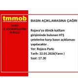 | Rojava`ya yönelik saldırı girişimine karşı TMMOB Diyarbakır İl Koordinasyon Kurulu tarafından 22 Ocak 2026 tarihinde Diyarbakır Rojava Parkında saat 17.30`da Basın Açıklaması yapılacaktır. |