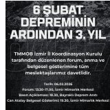 | TMMOB İzmir İl Koordinasyon Kurulu, 6 Şubat depremlerinin yıldönümünde yarın (6 Şubat 2026) anma etkinlikleri düzenliyor. Forum, basın açıklaması ve belgesel gösterimine tüm meslektaşlarımızı bekliyoruz. Etkinlik programına yazımızın devamından ulaşabilirsiniz. |