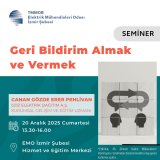 | Elektrik Mühendisleri Odası (EMO) İzmir Şubesi, 20 Aralık 2025 Cumartesi günü Canan Gözde Erer Pehlivan’ın sunumuyla “Geri Bildirim Almak ve Vermek” başlıklı seminer gerçekleştirilecektir. EMO İzmir Şubesi Kadın Mühendisler Komisyonu tarafından genel katılıma açık olarak Hizmet ve Eğitim Merkezi’nde düzenlenecek etkinlik, saat 13.30’da başlayacaktır. |