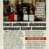 | TMMOB Elektrik Mühendisleri Odası`ndan (EMO) yapılan açıklamada, ABD ile enerji alanında yapılan anlaşmalara ilişkin yapılan değerlendirmede, `Bütün bu gelişmeler Türkiye`nin doğal kaynaklarının ve kültürel değerlerinin tahribatı pahasına, ülkemizin küresel enerji ağlarında bir dağıtım üssü olarak konumlandırılmasının hedeflendiğini göstermektedir. Enerji politikalarımızın toplumun gerçek ihtiyaçlarından çok uluslararası sermaye ve enerji tekellerinin çıkarlarına hizmet etmesi kabul edilemez` ifadeleri kullanıldı. |