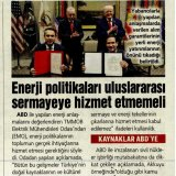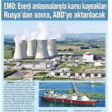 TMMOB Elektrik Mühendisleri Odası`ndan (EMO) yapılan açıklamada, ABD ile enerji alanında yapılan anlaşmalara ilişkin yapılan değerlendirmede, `Bütün bu gelişmeler Türkiye`nin doğal kaynaklarının ve kültürel değerlerinin tahribatı pahasına, ülkemizin küresel enerji ağlarında bir dağıtım üssü olarak konumlandırılmasının hedeflendiğini göstermektedir. Enerji politikalarımızın toplumun gerçek ihtiyaçlarından çok uluslararası sermaye ve enerji tekellerinin çıkarlarına hizmet etmesi kabul edilemez` ifadeleri kullanıldı. |