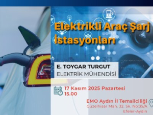Elektrik Mühendisleri Odası (EMO) İzmir Şubesi, EMO Aydın İl Temsilciği’nde E. Toygar Turgut katılımıyla 17 Kasım 2025 Pazartesi günü saat 15:00’da “Elektrikli Araç Şarj İstasyonları” başlıklı bilgilendirme toplantısı düzenleyecektir.